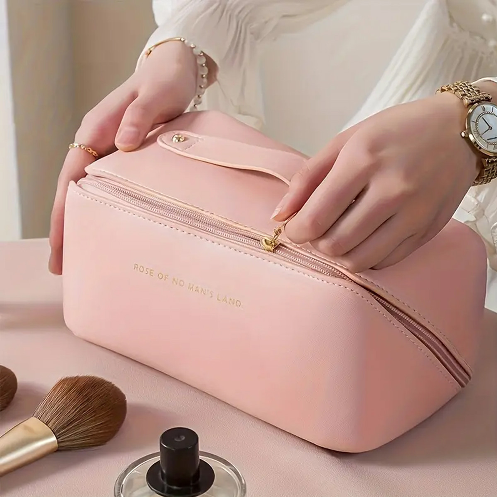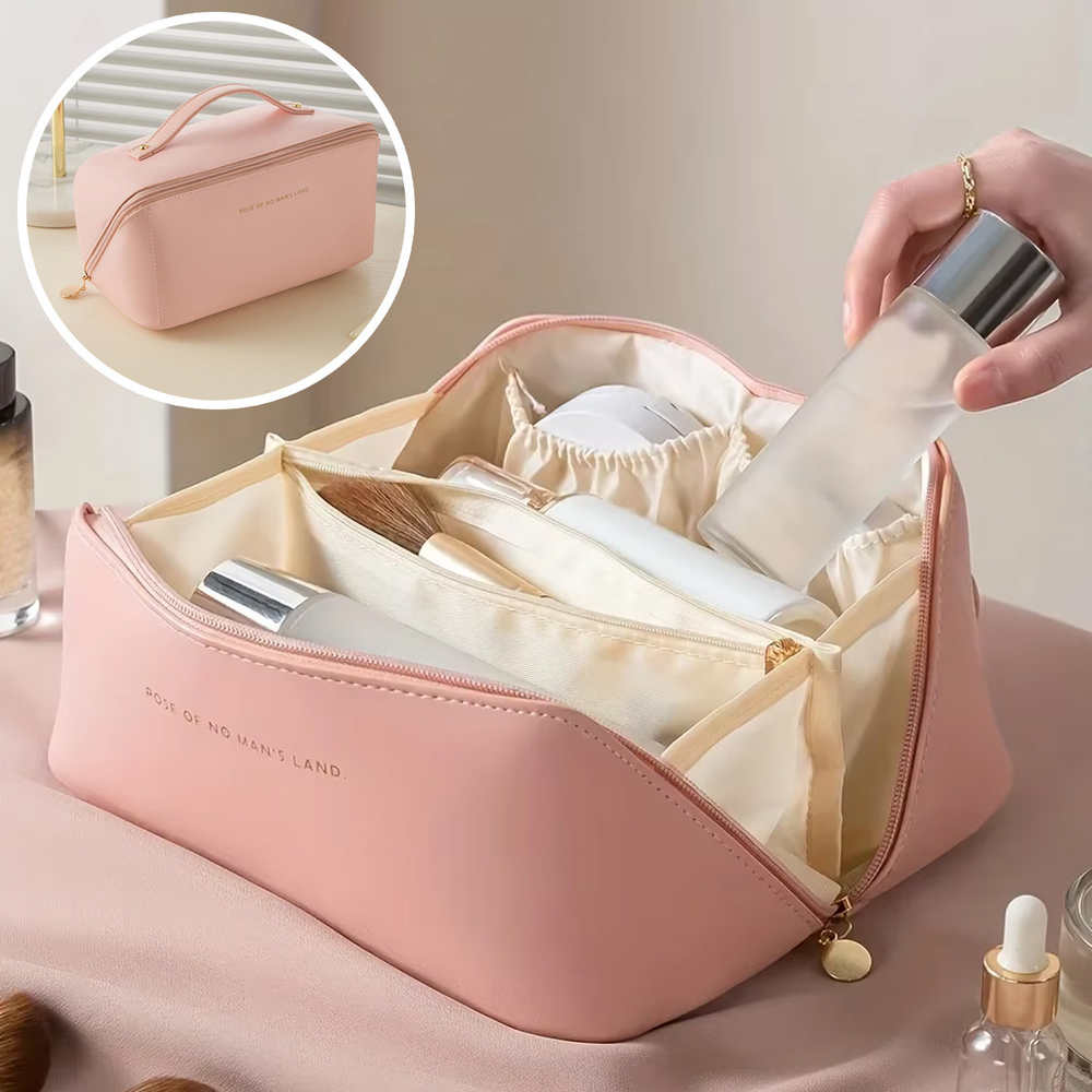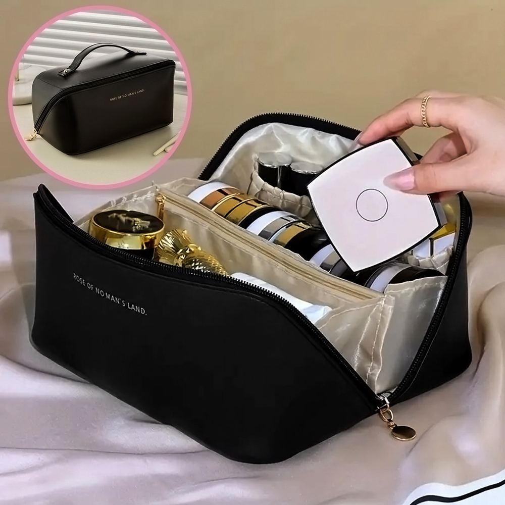 El Bolso se desplega y queda abierto para que puedas tener todo a mano. En su interior tiene divisiones y bolsillos para que puedas mantener ordenado y cuidado tu makeup.