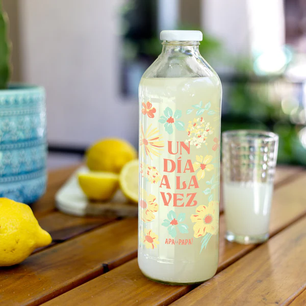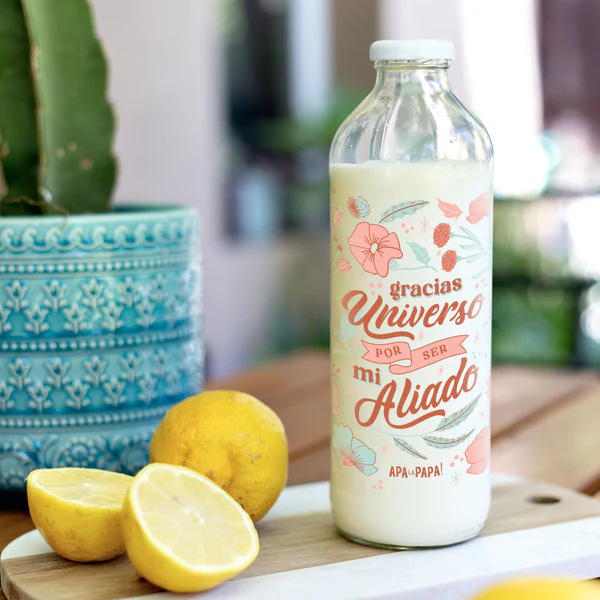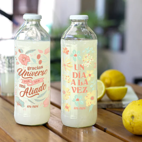 Botellas de vidrio con tapa metálica a rosca. Impresas en serigrafía a 2 colores. Con los diseños más hermosos para vestir tu mesa.